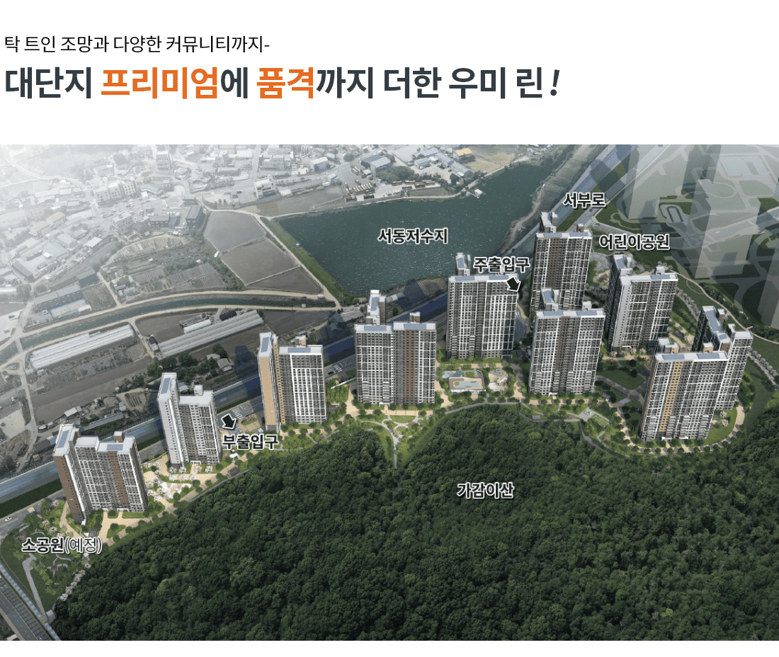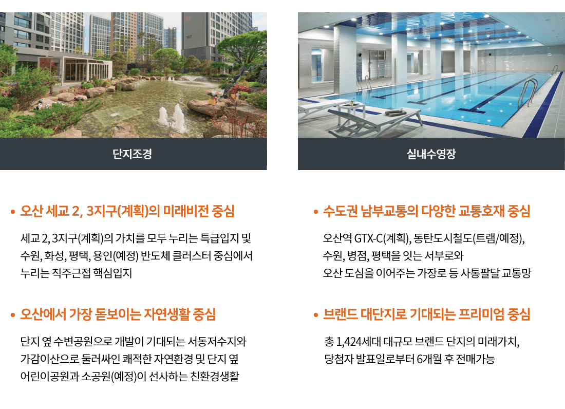 운행중인 오산역(1호선)과 GTX-C노선, 동탄도시철도, 분당선 연장 등 이 추진되고 있어 향후 교통 여건이 크게 개선될 예정입니다. 또한 가수초를 도보로 통학이 가능하며, 단지 동측으로 가감이산 조망과 단지 서측으로는 향후 세교2·3지구의 랜드마크가 될 것으로 예상되는 서동저수지의 수변공원 개발이 기대됩니다.